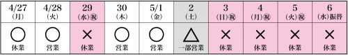 ゴールデンウィーク期間の休業日は、以下の通りとさせていただきます。